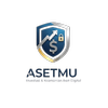 Digital security shield with upward arrow and dollar sign, with the text "ASET MU" and smaller text "Investasi & Keamanan Aset Digital" below.